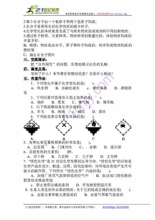 2. 物质的组成与结构:这部分会介绍物质的分类、元素、化合物、分子、原子等基本概念,让你对物质的构成有清晰的认识。